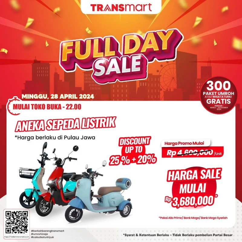 Media Kampung – 05 April 2026 | Transmart menggelar Full Day Sale dengan penawaran sepeda listrik yang harganya dipotong setengah, mulai Rp3 jutaan.