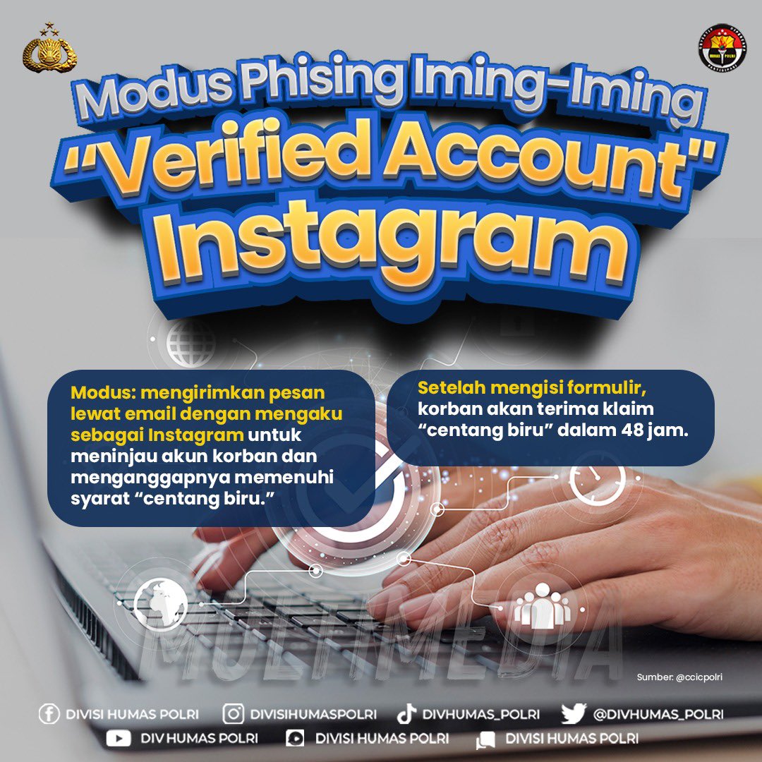 Namun, Polri memberikan peringatan kepada Sobat Polri untuk tetap waspada. Tidak ada jalan pintas untuk mendapatkan “verified account” di Instagram, dan tidak ada pihak yang dapat memberikan jaminan bahwa langkah-langkah tertentu akan berhasil. Langkah-langkah tersebut hanya akan membuka peluang bagi phiser untuk mencuri data dan merusak reputasi Anda.