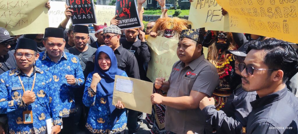 Banyuwangi – Seratus lebih jurnalis di Banyuwangi, Jawa Timur, gelar aksi tolak Revisi Rancangan Undang-Undang (RUU) Penyiaran, Senin (20/5/2024). Berbeda dengan daerah lain, demo didepan kantor DPRD Banyuwangi, tersebut bukan hanya menyoal adanya indikasi pembungkaman kemerdekaan pers.