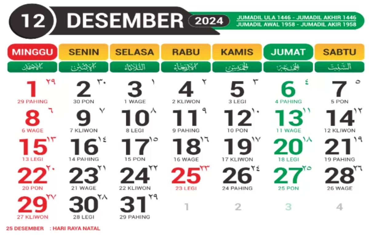 - 25 Desember: Rabu (Libur Nasional Natal)