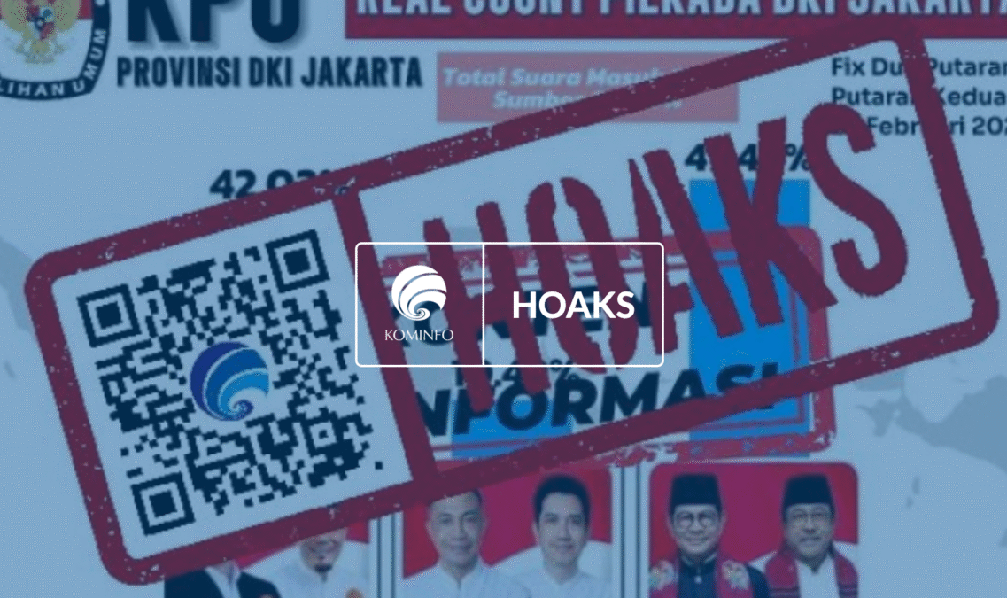 Media Kampung – Beredar informasi di media sosial yang mengklaim bahwa KPU DKI Jakarta telah merilis hasil real count Pilkada 2024. Informasi tersebut menampilkan perolehan suara ketiga pasangan calon, yaitu Ridwan Kamil-Suswono (42,02%), Dharma Pongrekun-Kun Wardana (10,49%), dan Pramono Anung-Rano Karno (47,49%).