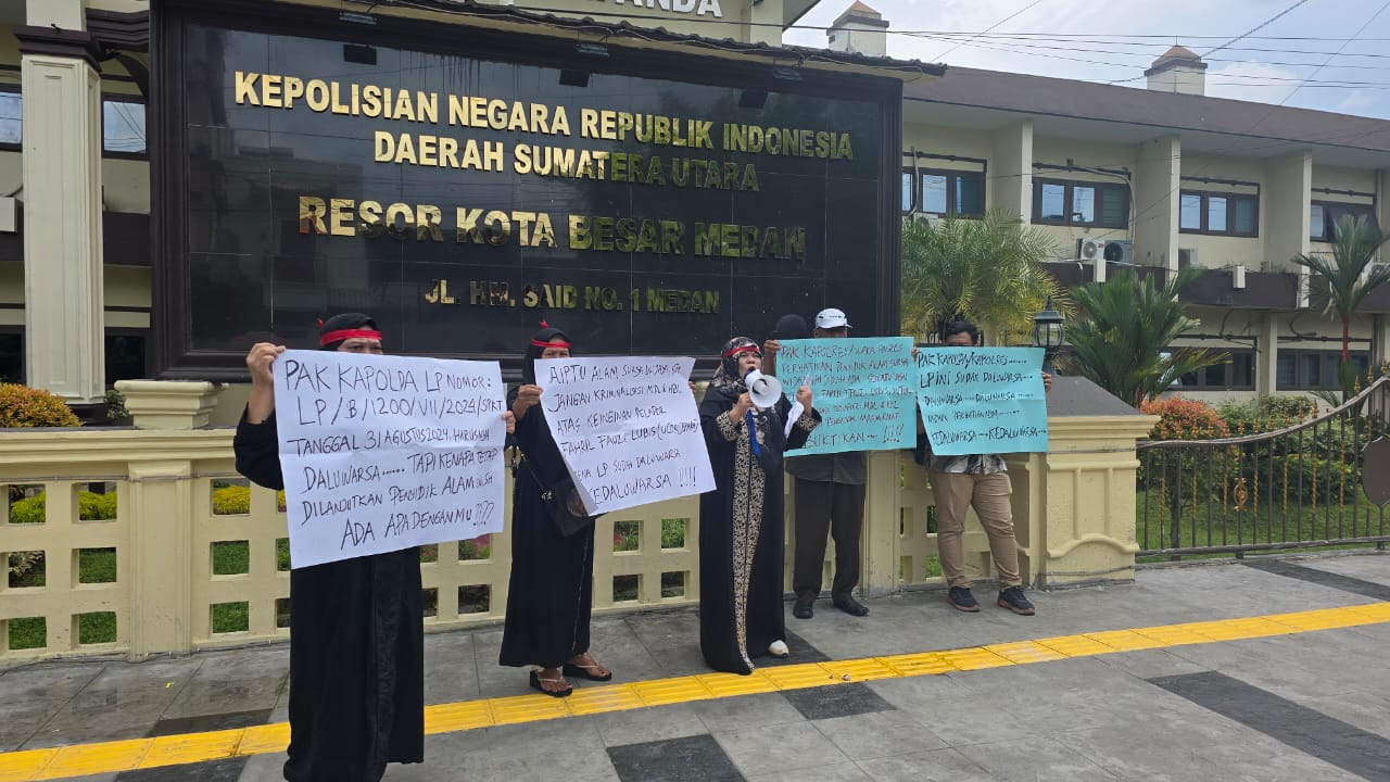 MEDAN – Sejumlah ibu rumah tangga menggelar aksi unjuk rasa di depan Mapolrestabes Medan, Rabu (3/9/2025). Mereka memprotes penanganan laporan polisi (LP) yang dianggap sudah kedaluwarsa namun masih diproses oleh penyidik Satreskrim Polrestabes Medan.