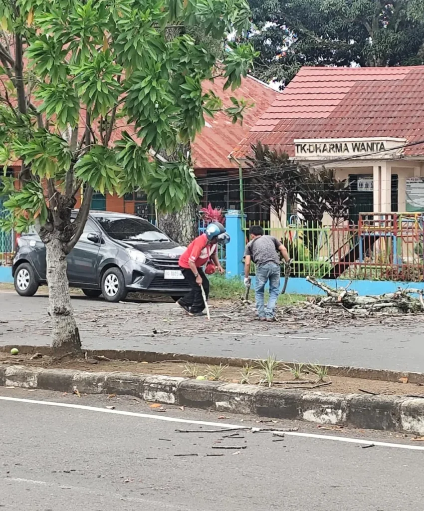 Para petugas melakukan penilaian lokasi, koordinasi lintas instansi, dan penarikan batang pohon yang menghalangi jalan.