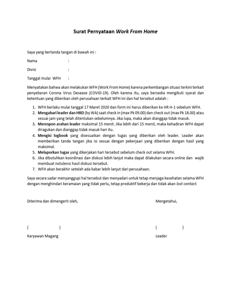 Isi surat edaran mencakup tiga poin utama: kriteria kelayakan, batas maksimal hari kerja di rumah, serta prosedur persetujuan antara perusahaan dan pekerja. Karyawan yang memiliki jabatan administratif, tugas yang dapat diselesaikan secara digital, atau yang berada di wilayah dengan risiko kesehatan tinggi dapat mengajukan WFH hingga lima hari kerja per minggu.