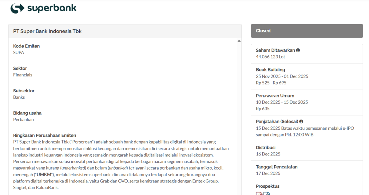 PT Super Bank Indonesia Tbk (SUPA) atau Superbank menggelar penawaran umum perdana saham (IPO) dengan melepas 4,4 miliar saham atau setara 13 persen dari modal ditempatkan dan disetor penuh. Masa penawaran umum berlangsung pada 10–15 Desember 2025.
