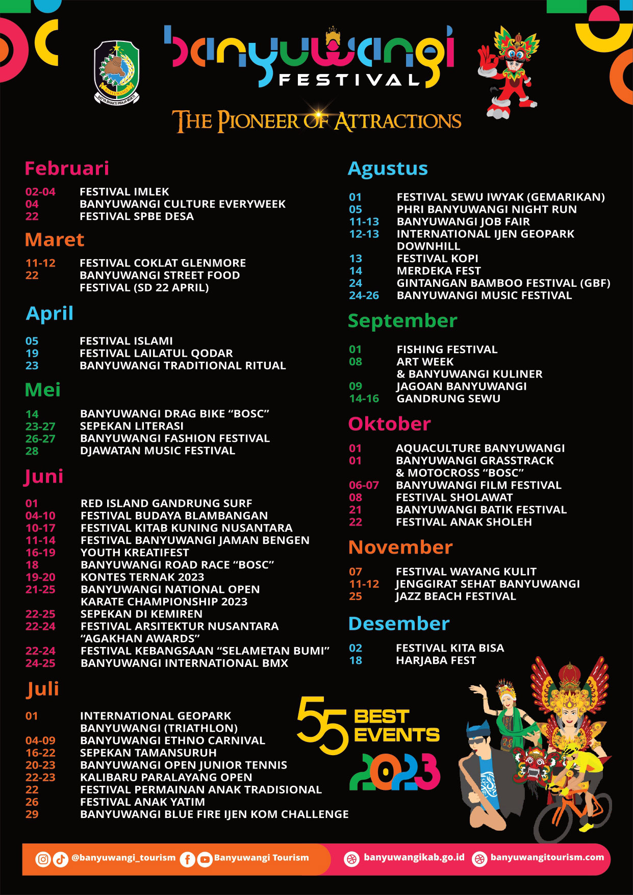 Seperti yang dilansir dari IG @banyuwangi_kab, bahwa Bupati Banyuwangi Ipuk Fiestiandani telah merilis Jadwal Event Festival Banyuwangi 2023. Sepanjang tahun 2023 akan dilaksanakan 55 Festival dengan bertemakan “Pioneer Of Attractions”