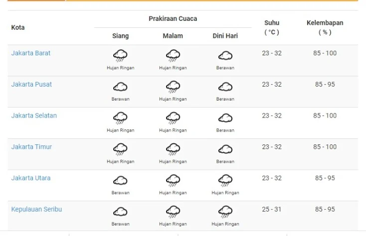 Suhu udara di Jakarta diperkirakan berfluktuasi antara 24 hingga 31 derajat Celsius, sementara kelembapan relatif berada pada kisaran 67 hingga 94 persen, menciptakan rasa lembab yang khas pada siang hari.