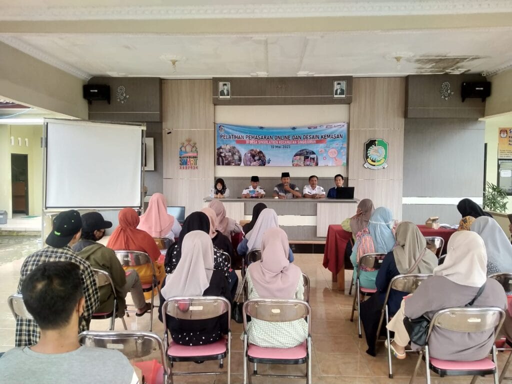 Banyuwangi, mediakampung.com – Pemerintah Desa Singolatren Kecamatan Singojuruh bersama Dinas Koperasi UMKM dan Perdagangan kabupaten Banyuwangi, menggelar pelatihan Pemasaran Online dan Desain Kemasan, dengan Nara sumber adalah Sari Persing craft. Pelatihan tersebut bertujuan sebagai upaya untuk meningkatkan penjualan hasil UMKM kerajinan dan kuliner, bertempat di pendopo Desa Singolatren, pada Rabu (10/5/2023).