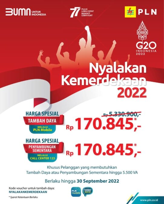 Promo ‘Nyalakan Kemerdekaan 2023’ berlaku selama periode 1-31 Agustus 2023, dan diharapkan dapat menjadi kontribusi positif dari PLN dalam menyemarakkan Hari Ulang Tahun Republik Indonesia yang ke-78.