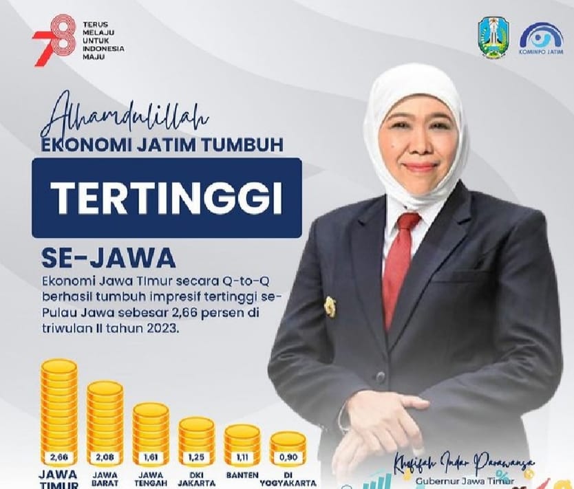 Keberhasilan ekonomi Jawa Timur pada Triwulan II 2023 juga memberikan dampak signifikan pada pertumbuhan perekonomian nasional, dengan kontribusi mencapai 14,45 persen, serta berkontribusi sebanyak 25,23 persen terhadap perekonomian keseluruhan Pulau Jawa.