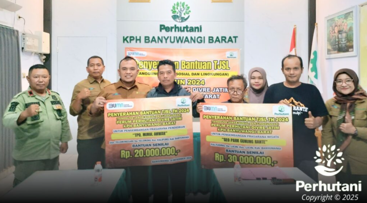 Banyuwangi, Jawa Timur – Perum Perhutani Kesatuan Pemangkuan Hutan (KPH) Banyuwangi Barat menyalurkan dana Tanggung Jawab Sosial dan Lingkungan (TJSL) atau Corporate Social Responsibility (CSR) kepada masyarakat sekitar hutan pada Rabu (22/1/2025). Penyerahan bantuan senilai total Rp 50 juta ini berlangsung di kantor Perhutani Jalan Jaksa Agung Suprapto Nomor 34, Banyuwangi.