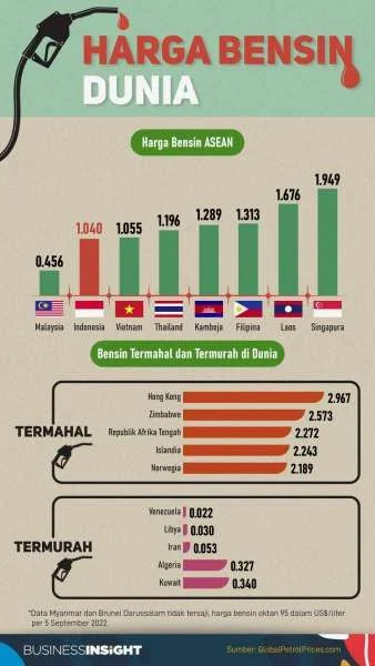 Di kawasan ASEAN, harga bensin bervariasi; Vietnam sekitar Rp15.678 per liter, Thailand Rp21.559, Singapura Rp28.359, dan Malaysia Rp19.199 untuk varian premium.