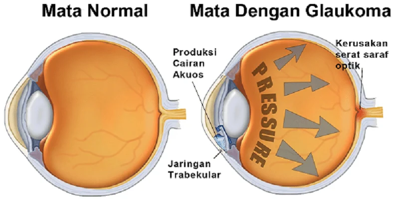 Penyakit ini terjadi akibat kerusakan saraf optik, biasanya dipicu oleh peningkatan tekanan intraokular (tekanan dalam bola mata). Tekanan yang terus naik menekan serabut saraf yang mengirimkan sinyal visual ke otak, menyebabkan sel‑sel saraf mati secara progresif.