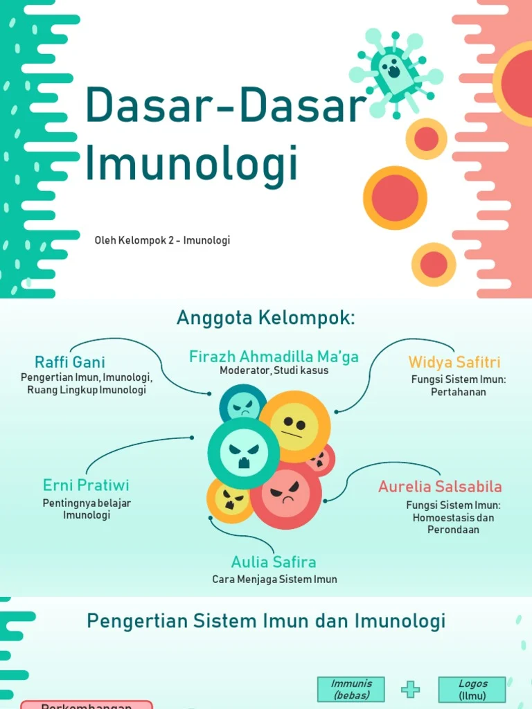 Sistem imun terbagi menjadi dua garis pertahanan utama: imun bawaan (innate) dan imun adaptif. Imun bawaan memberikan respons cepat terhadap patogen umum, sedangkan imun adaptif belajar mengenali ancaman spesifik dan menghasilkan memori imun. Sel-sel penting seperti neutrophil, makrofag, sel B, dan sel T bekerja secara sinergis untuk melindungi tubuh.