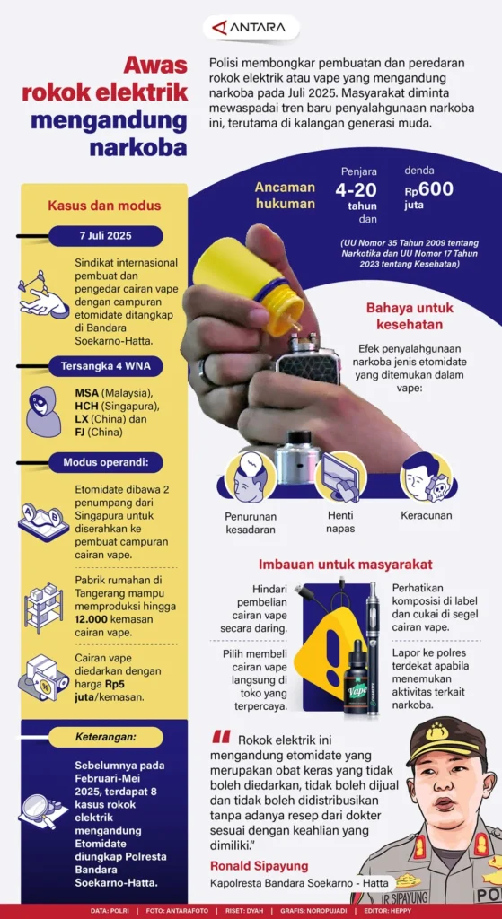 Kementerian Kesehatan menegaskan bahwa zat nikotin dan bahan kimia lain dalam e‑liquid dapat menyebabkan gangguan pernapasan, iritasi mulut, serta potensi kecanduan pada remaja. Menteri Kesehatan, Budi Gunadi, menambahkan bahwa belum ada bukti ilmiah yang menyatakan vape aman bagi kesehatan publik.