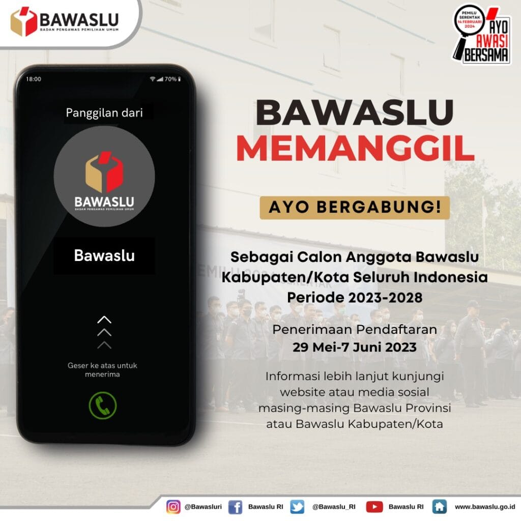Jakarta, Mediakampung.com – Badan Pengawas Pemilihan Umum (Bawaslu) memberikan kesempatan kepada masyarakat untuk bergabung sebagai anggota Bawaslu Kabupaten/Kota di seluruh Indonesia dalam periode 2023-2028. Melalui pengumuman resmi yang diunggah di Akun resmi media sosial Bawaslu, Bawaslu mengajak seluruh #SahabatBawaslu untuk memanfaatkan kesempatan ini.