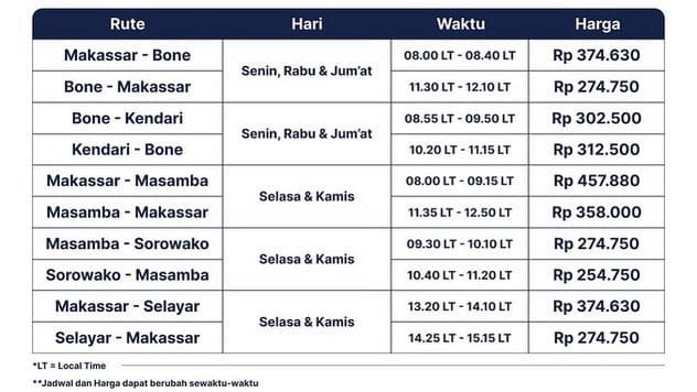 Makassar, 23 Mei 2023 – Maskapai penerbangan Susi Air Indonesia telah mengumumkan jadwal dan rute penerbangan mereka di Makassar, Sulawesi Selatan. Diluncurkan sebagai bagian dari Penerbangan Subsidi Pemerintah Sulawesi Selatan 2023, Susi Air berharap dapat meningkatkan konektivitas dan aksesibilitas bagi masyarakat setempat. Berikut jadwal dan rute penerbangan yang tersedia: