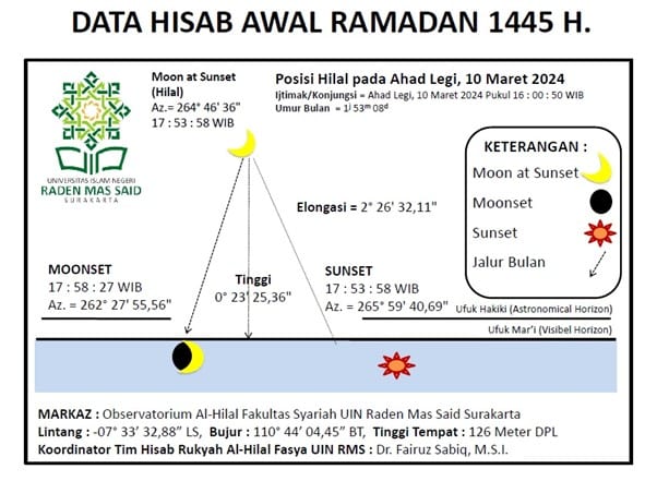 Data hisab di Observatorium Al-Hilal Fakultas Syariah UIN Raden Mas Said Surakarta menunjukkan bahwa pada 10 Maret 2024, hilal tidak terlihat dengan tinggi hilal masih di bawah 3̊. Observatorium Al-Hilal memiliki lintang -7˚ 33’ 32,88” dan bujur 110˚ 44’ 04,45” serta tinggi tempat 126 Meter DPL.
