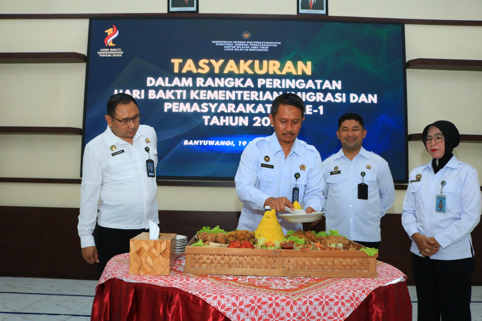 BANYUWANGI — Lembaga Pemasyarakatan (Lapas) Kelas IIA Banyuwangi menggelar acara tasyakuran sebagai puncak peringatan Hari Bakti Kementerian Imigrasi dan Pemasyarakatan (Kemenimipas) ke-1 pada Rabu (19/11). Seluruh jajaran pegawai hadir dalam kegiatan yang berlangsung khidmat di Aula Sahardjo.