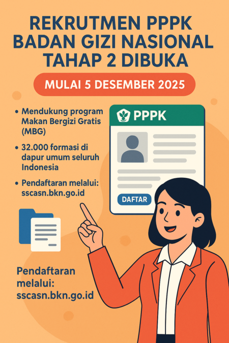 Rekrutmen PPPK Badan Gizi Nasional (BGN) Tahap II resmi dibuka mulai 5 Desember 2025. BGN adalah lembaga yang bertanggung jawab atas Program Makan Bergizi Gratis (MBG), sesuai amanat Perpres Nomor 83 Tahun 2024. Rekrutmen ini dibutuhkan untuk memperkuat operasional dapur umum di seluruh Indonesia.