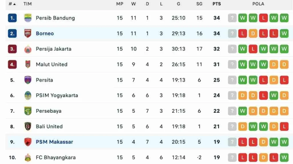 Persib Bandung menempati puncak klasemen dengan 60 poin, selisih gol +20, dan hanya empat kekalahan sejak musim dimulai.