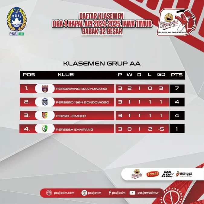 Banyuwangi, Jawa Timur โ Babak 32 besar Liga 4 Kapal Api PSSI Jawa Timur 2024-2025 telah memasuki fase grup. Berdasarkan klasemen sementara yang dirilis PSSI Jawa Timur, beberapa klub telah menunjukkan performa yang menonjol di berbagai grup.
