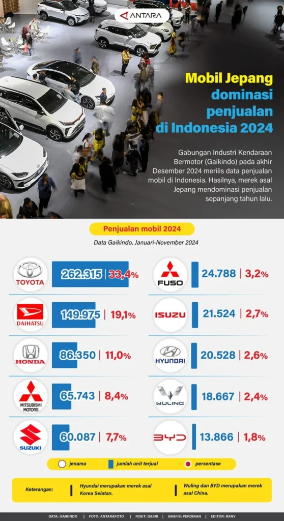 Data Gaikindo menunjukkan bahwa lima merek Jepang – Toyota, Daihatsu, Honda, Suzuki, dan Mitsubishi – masih memegang mayoritas pangsa pasar, namun persentasenya menurun secara konsisten sejak 2023.