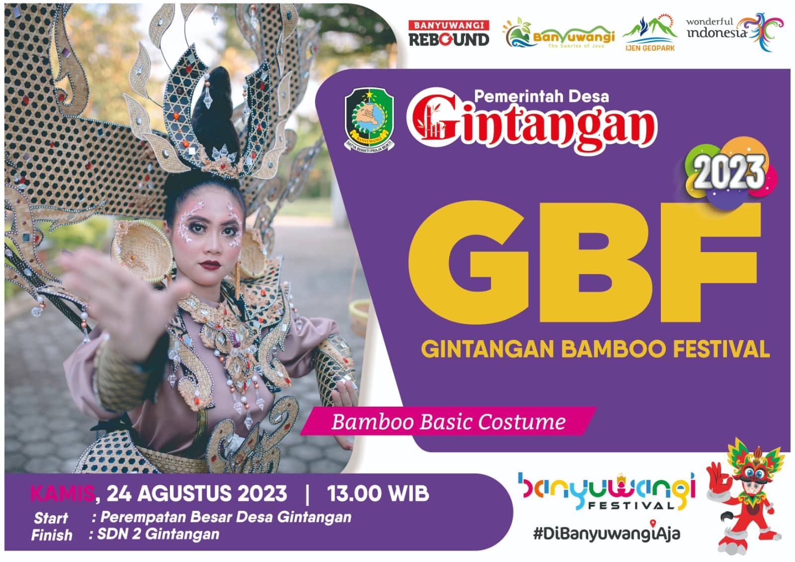Media Kampung – Desa Gintangan, terletak di kecamatan Blimbingsari, telah menjadi tujuan wisata utama di Kabupaten Banyuwangi. Gintangan Bamboo Festival akan diselenggarakan pada 24 Agustus 2023, dimulai pukul 13.00 hingga selesai. Dengan tema “Jajang Panguripan,” festival ini mengangkat semangat kehidupan berarti yang dicontohkan oleh masyarakat Gintangan, yang menggantungkan hidup dari kerajinan bambu.