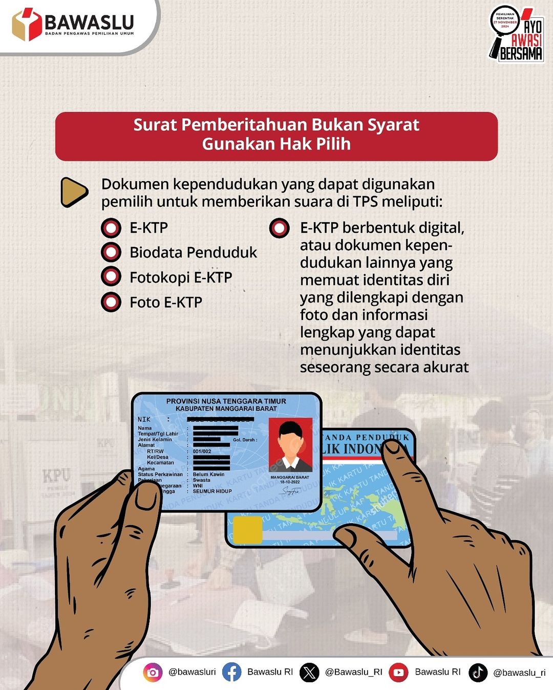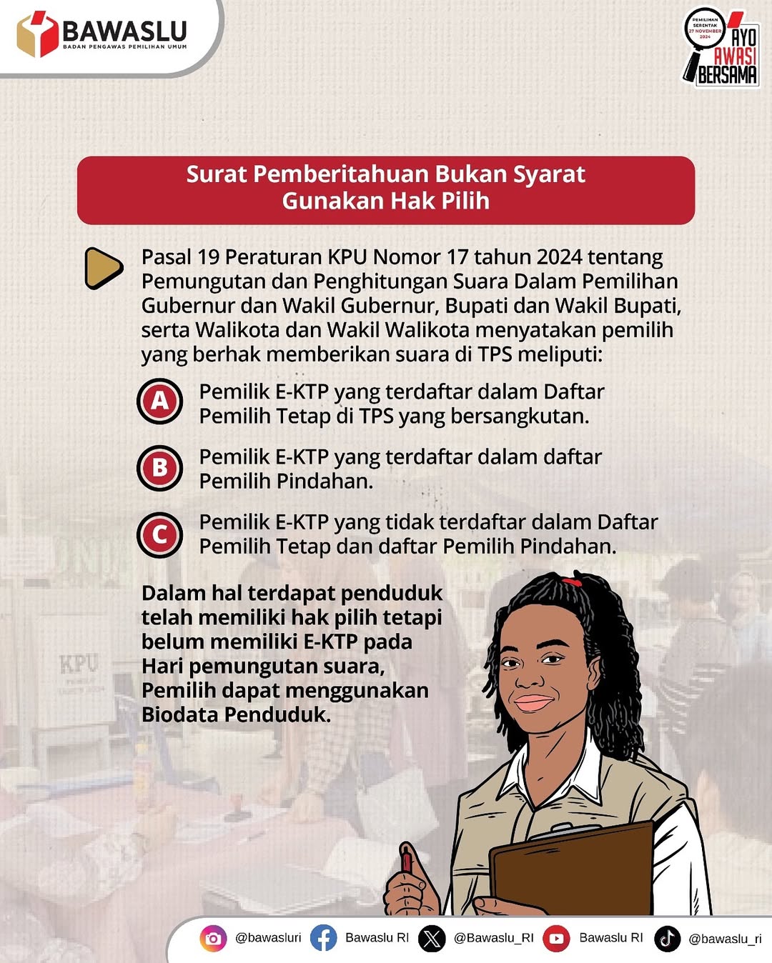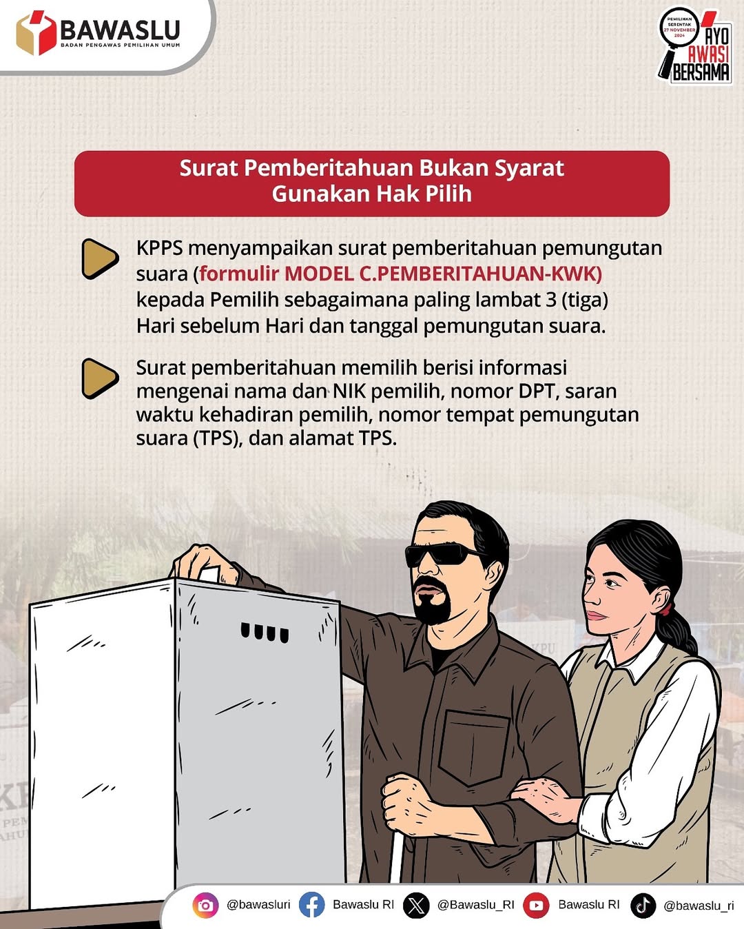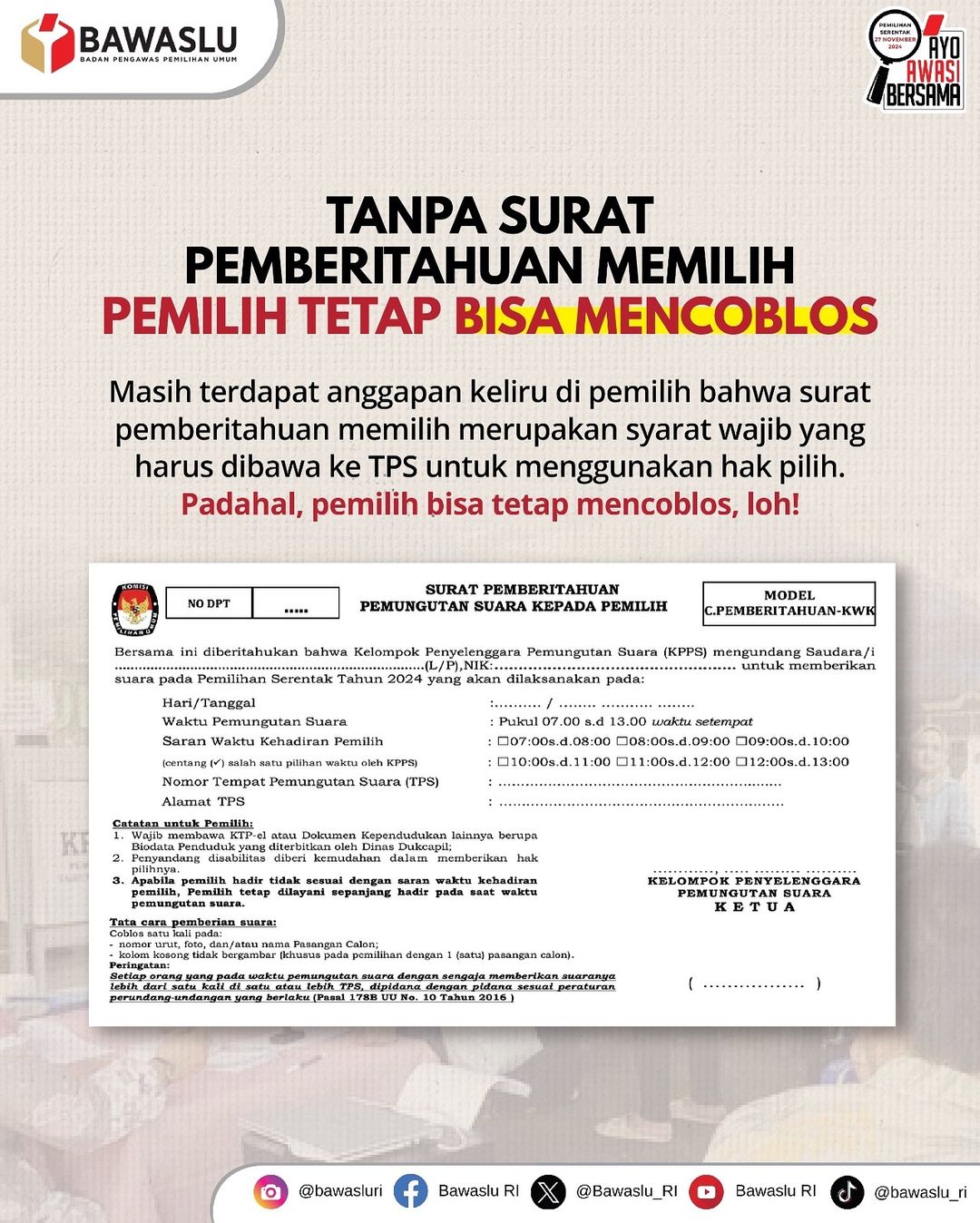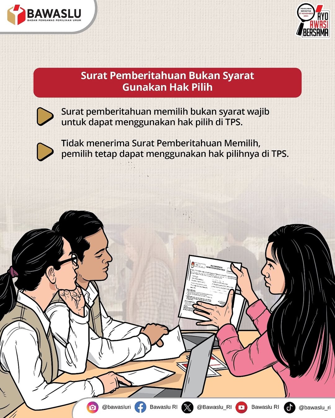 Media Kampung – Masih banyak yang salah kaprah nih! Banyak yang mengira surat pemberitahuan memilih itu wajib dibawa ke TPS saat Pilkada 2024. Padahal, menurut Bawaslu, surat pemberitahuan itu bukan syarat wajib untuk menggunakan hak pilih!