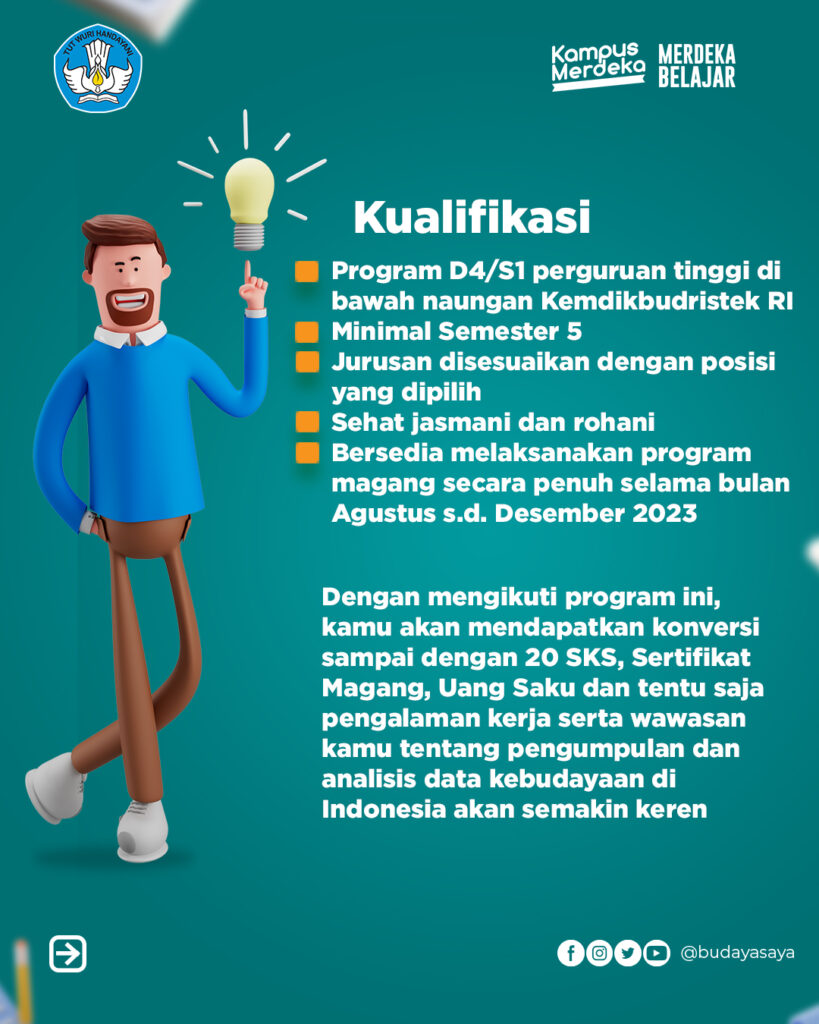 Menyadari pentingnya peran Sahabat Budaya dalam memperkaya dan melestarikan kebudayaan Indonesia, Kemendikbudristek mengimbau agar kesempatan ini tidak dilewatkan begitu saja. Program Magang Bersertifikat Kebudayaan ini diharapkan dapat memberikan kontribusi nyata dalam memajukan kebudayaan serta mengembangkan pemahaman dan keterampilan Sahabat Budaya dalam bidang kebudayaan.