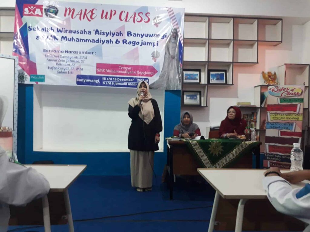 Media Kampung – SMK Muhammadiyah 6 Rogojampi mengadakan pelatihan merias yang menggandeng Perwakilan Make Up Artist (MUA) dari SWA PDA Banyuwangi dan Mendapatkan Sponsor dari Warda Banyuwangi. Kegiatan ini dihadiri oleh 20 siswi dari kelas XI dan XII Program Studi TJKT dan PPLG.