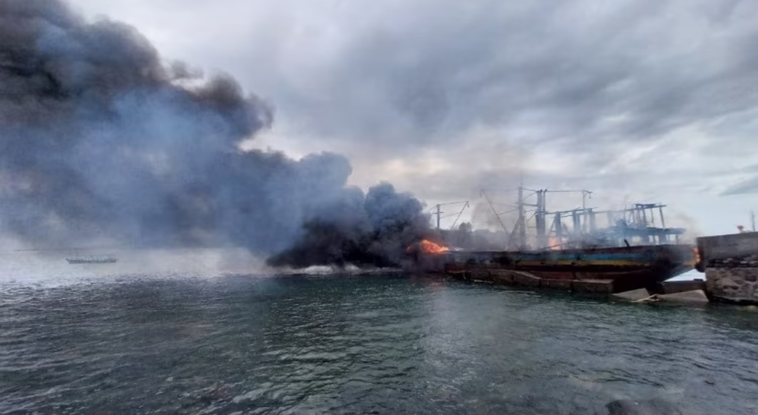 Banyuwangi – Dua kapal ikan, Bahtera Makmur dan Dinda Jaya, terbakar hebat di Dermaga Pelabuhan Masami, Kalipuro, Banyuwangi, Senin (2/12) siang. Kedua kapal tersebut dikabarkan sudah tidak beroperasi selama lebih dari delapan bulan dan bersandar tanpa awak.