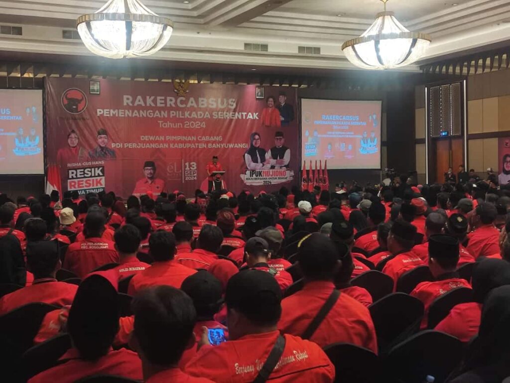 Banyuwangi – Dewan Pimpinan Cabang (DPC) PDI Perjuangan Kabupaten Banyuwangi menggelar Rapat Kerja Cabang Khusus (Rakercabsus) di Ballroom Hotel El Royal, Kecamatan Kabat, Banyuwangi, pada Jumat (13/09/2024). Acara tersebut digelar dalam rangka konsolidasi menjelang Pilkada Serentak 2024.