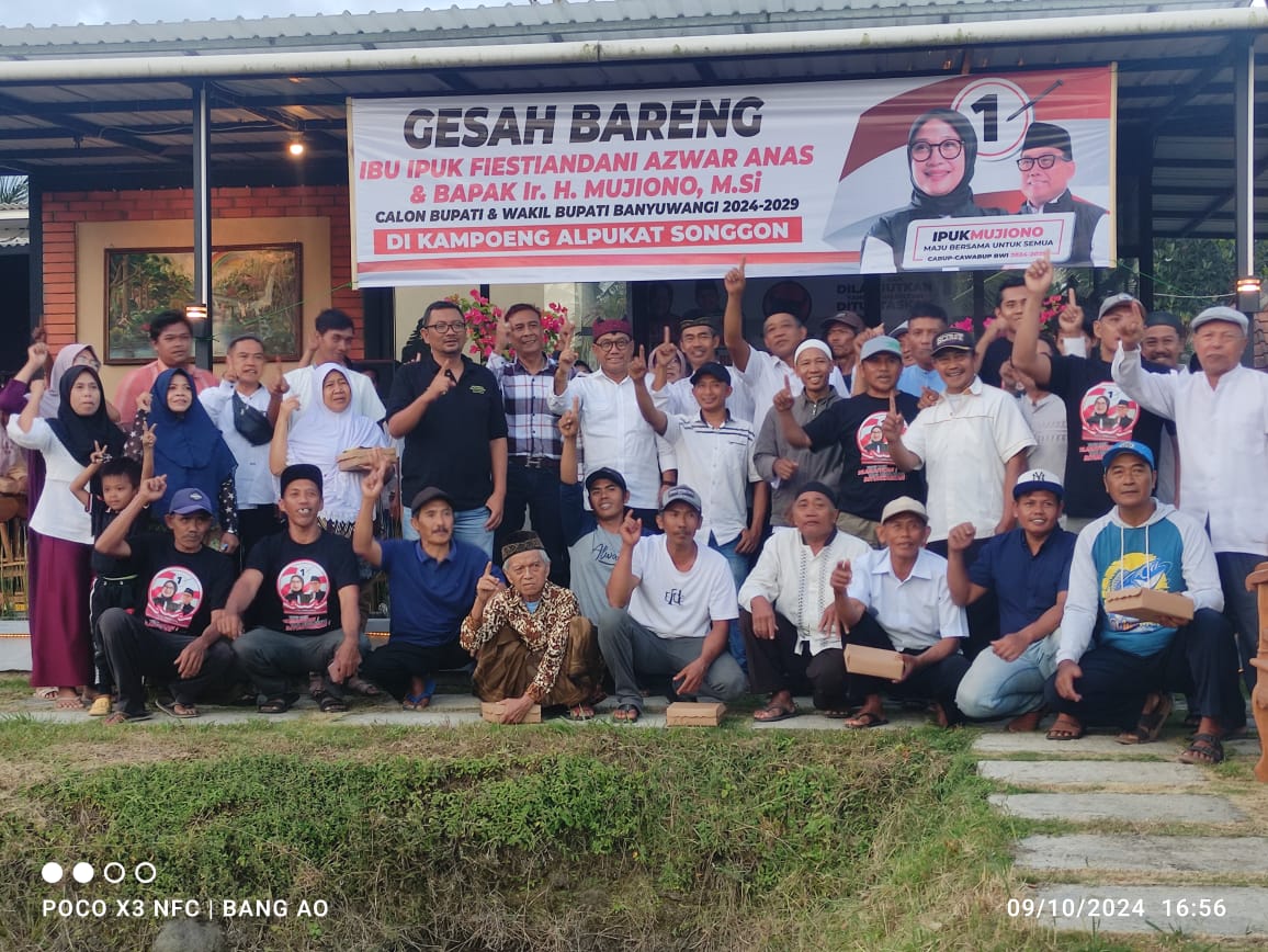 Songgon, Banyuwangi – Calon Wakil Bupati (Cawabup) Banyuwangi nomor urut 01, H. Mujiono, melakukan kunjungan ke Kampoeng Alpukat, Desa Parangharjo, Kecamatan Songgon, Rabu (9/10/2024). Dalam acara bertajuk “Gesah Bareng,” Mujiono berdialog langsung dengan warga, menyerap aspirasi terkait pelayanan masyarakat, pertanian, dan pemberdayaan UMKM. Turut hadir Ketua DPRD Banyuwangi sekaligus Ketua DPC PDI Perjuangan, I Made Cahyana Negara, pemilik homestay Kampoeng Alpukat, Erwin, serta sejumlah relawan pemuda Parangharjo.
