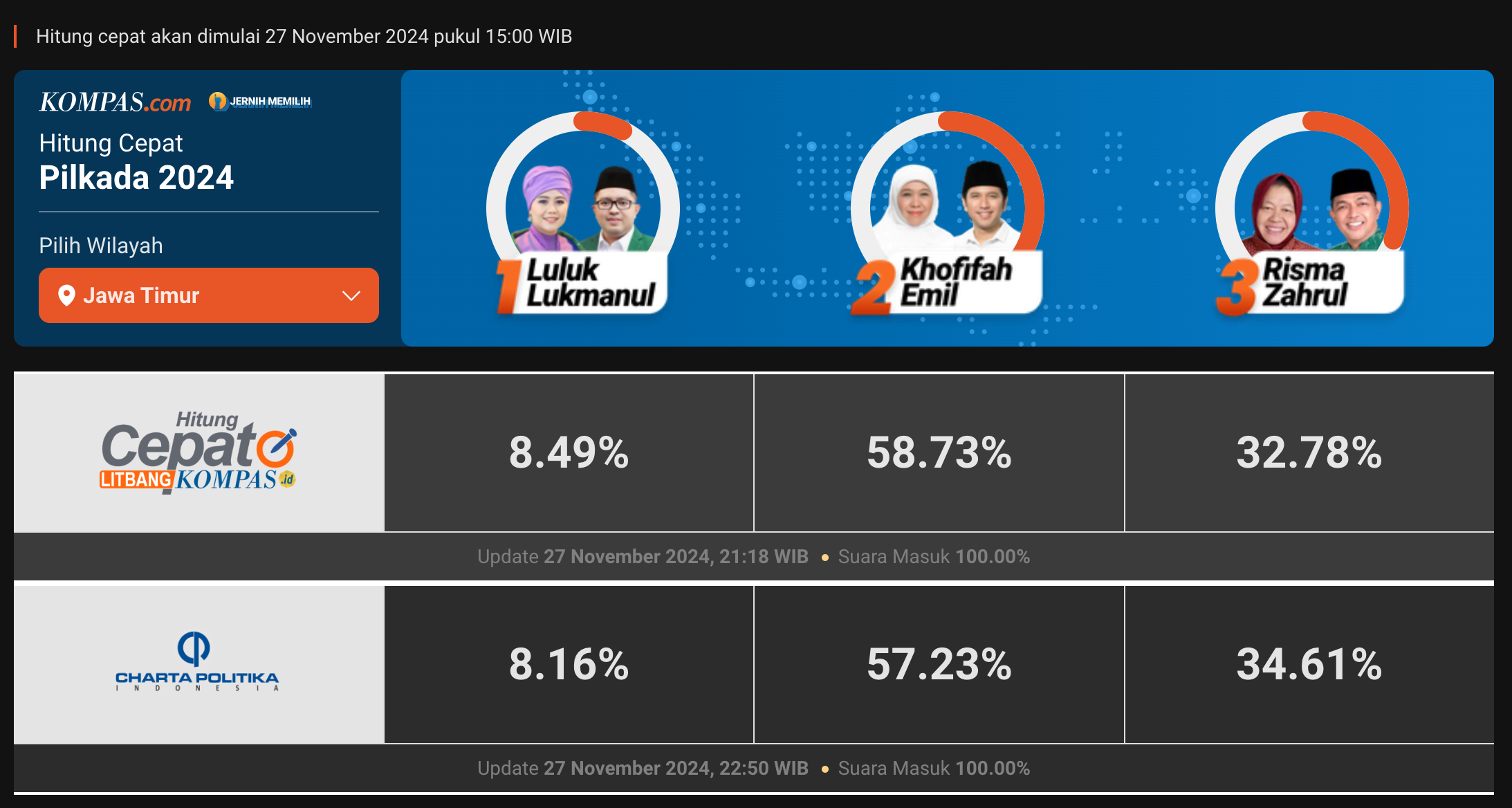 Beberapa lembaga survei juga melaksanakan quick count Pilgub Jatim 2024. Hasilnya akan dirilis paling cepat pukul 15.00 WIB hari ini. Berikut tautan untuk memantau hasilnya: