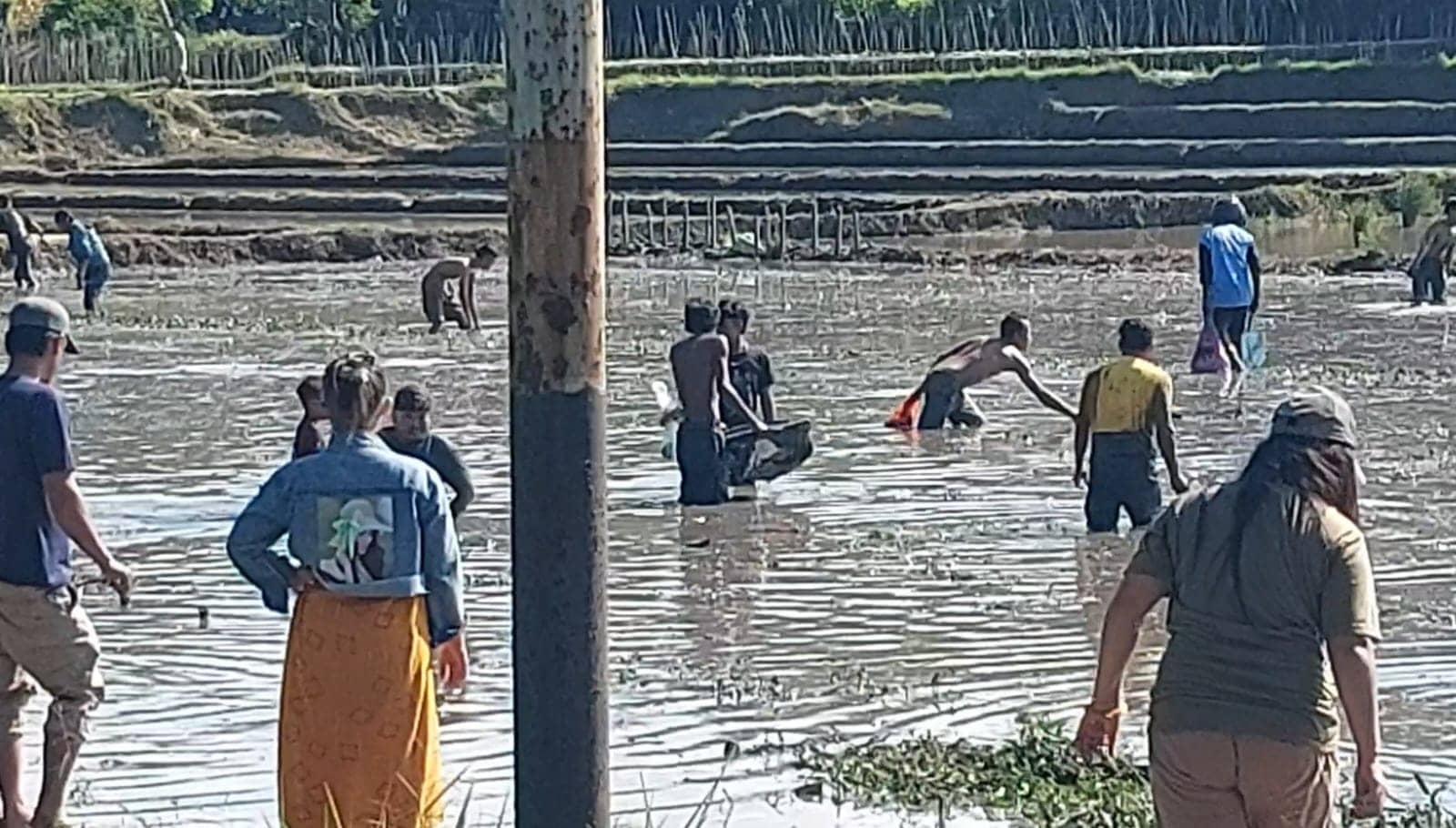 Kolam sawah yang surut ini menjadi kesempatan bagi warga sekitar lokasi untuk beramai-ramai menangkap ikan secara gratis dalam jumlah ratusan kilogram.
