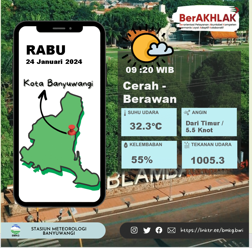 BANYUWANGI – Cuaca di Kabupaten Banyuwangi pada hari ini, tanggal 24 Januari 2024, menunjukkan kondisi yang relatif stabil dengan variasi suhu yang nyaman. Berdasarkan informasi dari Badan Meteorologi, Klimatologi, dan Geofisika (BMKG), berikut adalah ringkasan kondisi cuaca terkini di Kabupaten Banyuwangi: