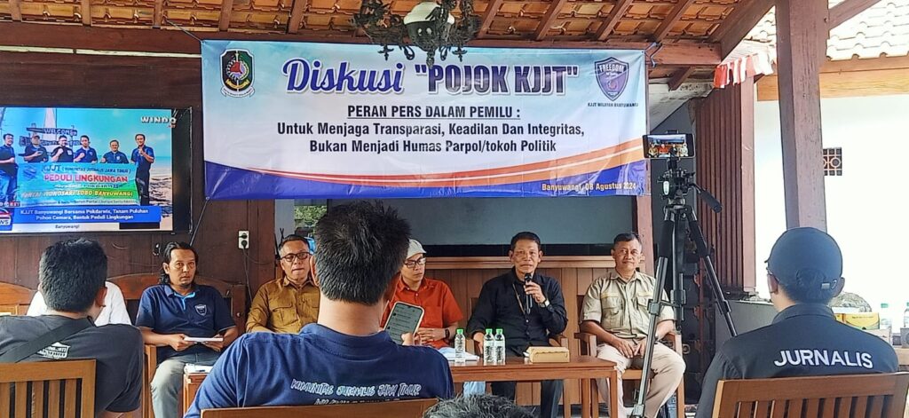 Banyuwangi, 8 Agustus 2024 – Komunitas Jurnalis Jawa Timur (KJJT) wilayah Banyuwangi menggelar Diskusi Pojok KJJT bertema “Peran Pers dalam Pemilu: Menjaga Transparansi, Keadilan, dan Integritas, Bukan Menjadi Humas atau Tokoh Politik” di Aula Warung NKRI Bangkesbanpol. Acara ini dihadiri oleh para praktisi pers, penulis, sastrawan, serta Humas TNI dan Polri.