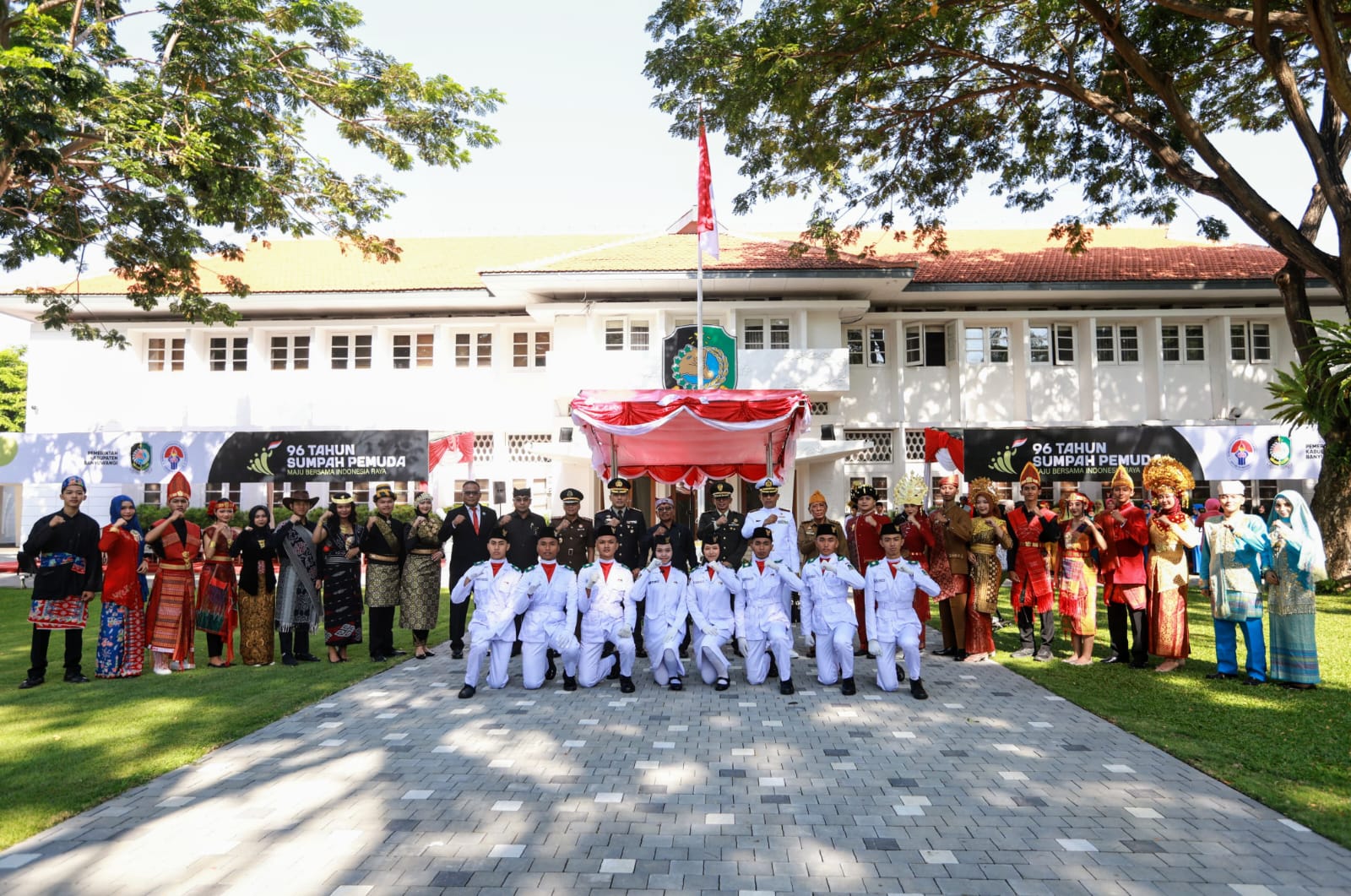 Banyuwangi, Jawa Timur – Pemkab Banyuwangi menggelar Upacara Peringatan Sumpah Pemuda ke-96 dengan khidmat di halaman Kantor Bupati Banyuwangi pada Senin pagi, 28 Oktober 2024. Ratusan pelajar dan mahasiswa berkumpul, mengenakan berbagai busana adat dari seluruh nusantara, memperlihatkan kebhinekaan Indonesia dalam semangat persatuan.