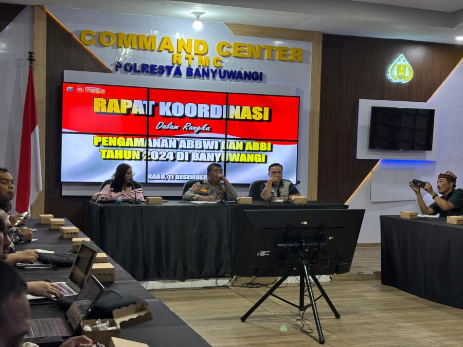Banyuwangi – Menjelang pelaksanaan Aku Bangga Berwisata di Indonesia (ABBWI) dan Anugerah Bangga Buatan Indonesia (BBWI) 2024 di Banyuwangi, Polresta Banyuwangi menggelar rapat koordinasi (rakor) pengamanan bersama instansi terkait. Rapat berlangsung di command center Polresta Banyuwangi, Rabu (11/12).