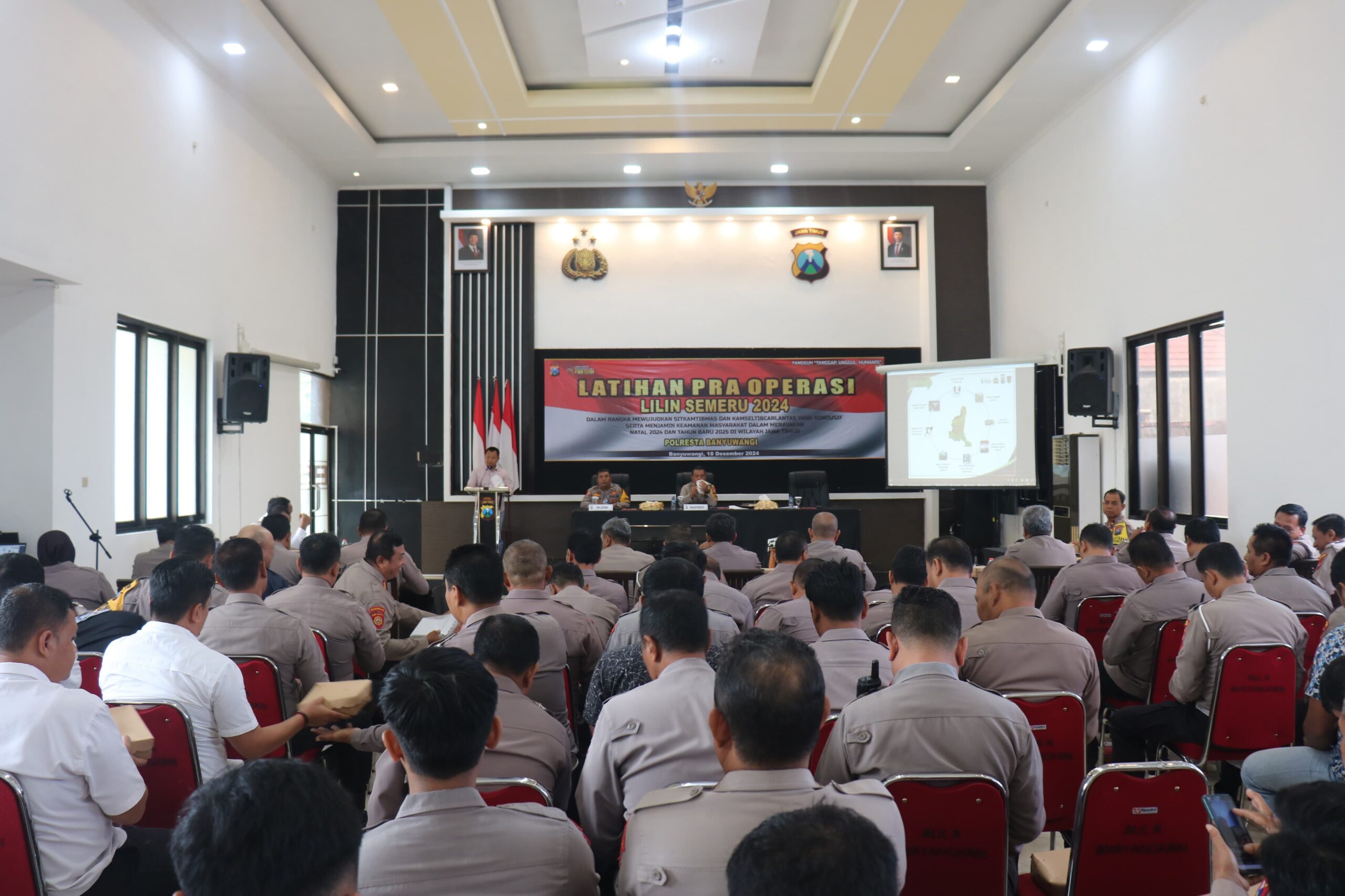 Polresta Banyuwangi menggelar Latihan Pra Operasi (Lat Pra Ops) Lilin Semeru 2024 di Rupatama Polresta Banyuwangi, Rabu (18/12). Kegiatan ini bertujuan untuk mempersiapkan personel dalam mengamankan libur Natal 2024 dan Tahun Baru 2025 (Nataru).