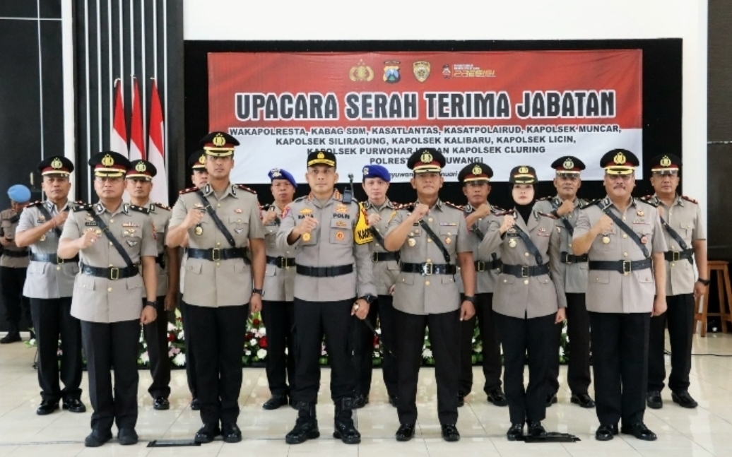 Banyuwangi – Polresta Banyuwangi melaksanakan serah terima jabatan (Sertijab) sejumlah pejabat di Gedung Rupatama Wira Pratama, Sabtu (18/1/2025). Upacara dipimpin oleh Kapolresta Banyuwangi, Kombespol Rama Samtama Putra, dan dihadiri Pejabat Utama (PJU), Kapolsek Jajaran, serta anggota Polresta Banyuwangi.