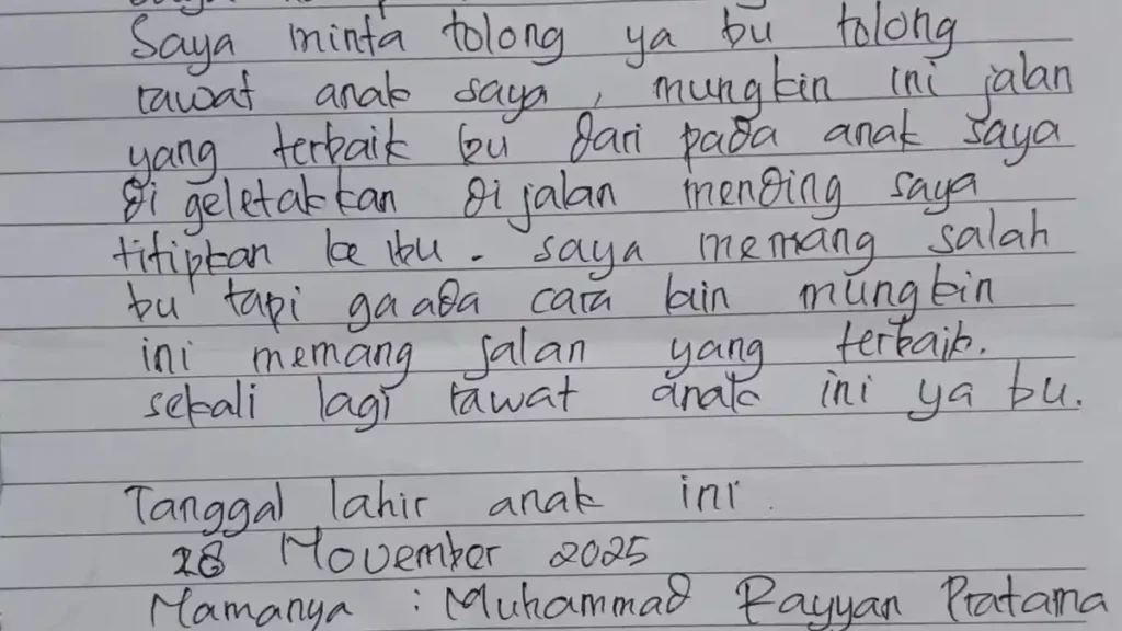 Banyuwangi – Bayi laki-laki yang ditemukan di teras rumah warga Desa Olehsari, Kecamatan Glagah, Kabupaten Banyuwangi, Rabu (14/1/2026) malam, ditinggalkan bersama secarik surat tulisan tangan. Dalam surat tersebut, orang tua bayi meminta agar peristiwa itu tidak disebarluaskan.