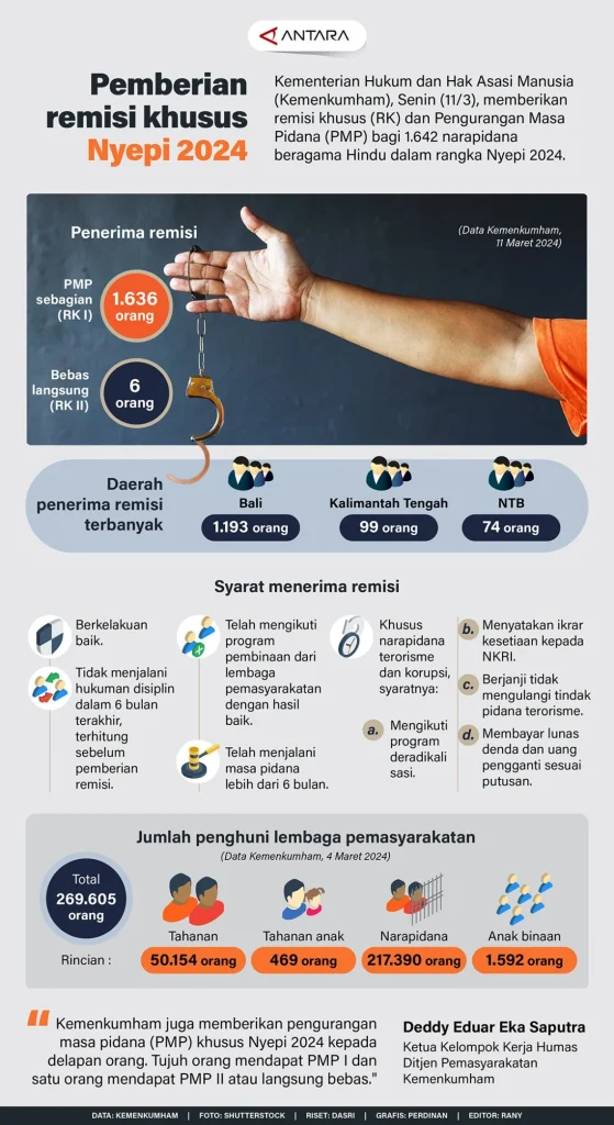 Remisi khusus Nyepi telah diatur dalam peraturan perundang‑undangan, memungkinkan Kementerian Pemasyarakatan memberikan keringanan pada hari‑hari perayaan tertentu. Pemberian remisi ini harus melalui prosedur verifikasi administratif yang ketat.