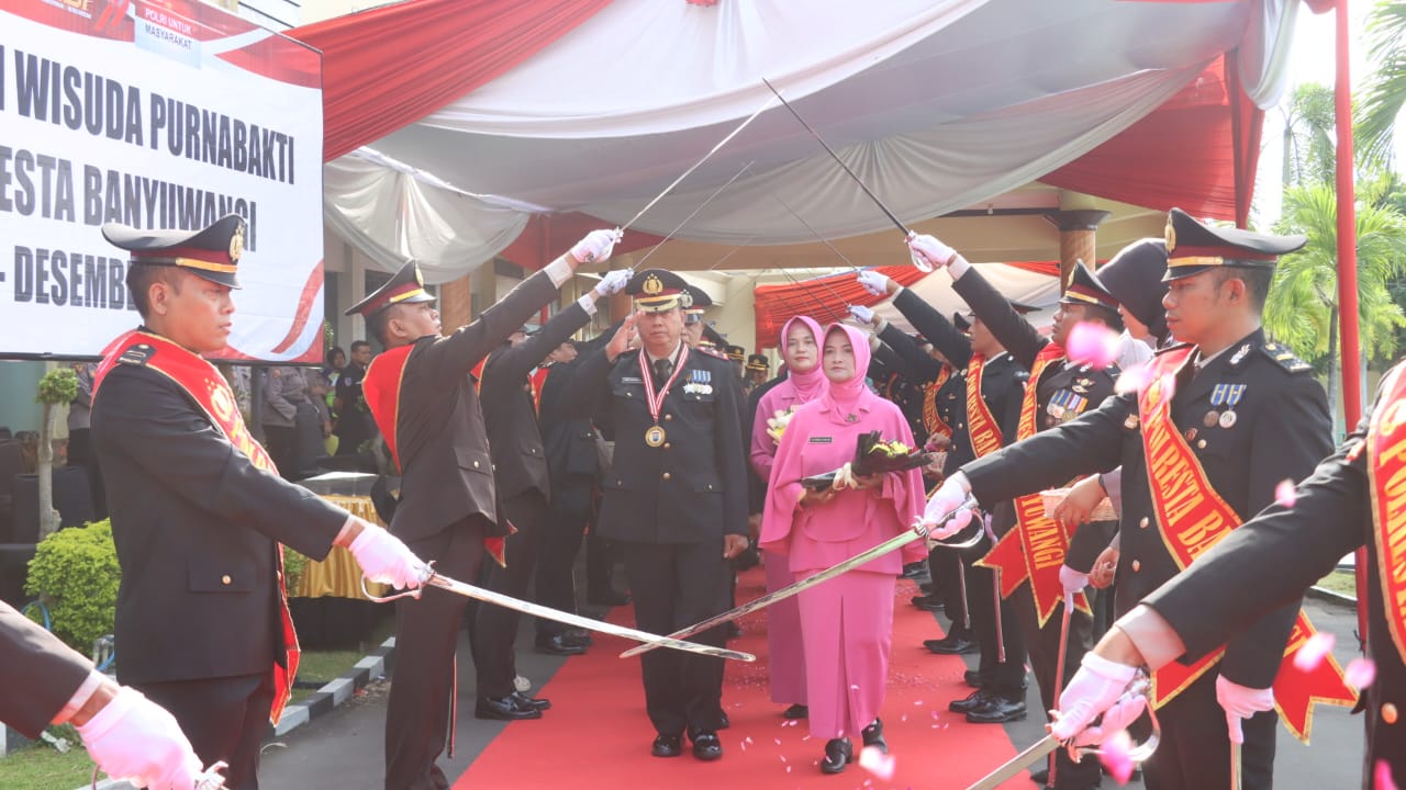 Pada kesempatan yang sama, Polresta Banyuwangi juga melaksanakan pelepasan 9 personel yang memasuki masa purna bhakti. Prosesi pelepasan dilakukan melalui tradisi pedang pora sebagai simbol penghormatan atas pengabdian mereka selama berdinas di Polri.