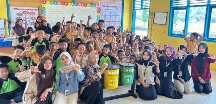Mahasiswa menjelaskan, “Dengan menimbang dan memilah sampah, anak-anak belajar nilai ekonomi dari barang bekas dan pentingnya menabung sampah”.