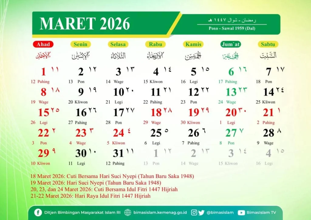 Pengumuman ini datang bersamaan dengan laporan tentang penetapan tanggal 1 Syawal 1447 Hijriah pada 21 Maret 2026 oleh Kementerian Agama.
