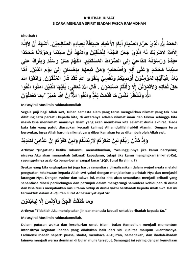 Khatib menegaskan bahwa Jumat pertama setelah Ramadan membawa tanggung jawab khusus untuk mempertahankan momentum puasa dan shalat.
