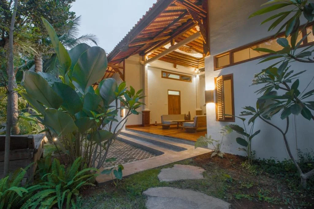 - Menggunakan bahan bangunan lokal, seperti bambu, kayu jati, atau batu alam.
